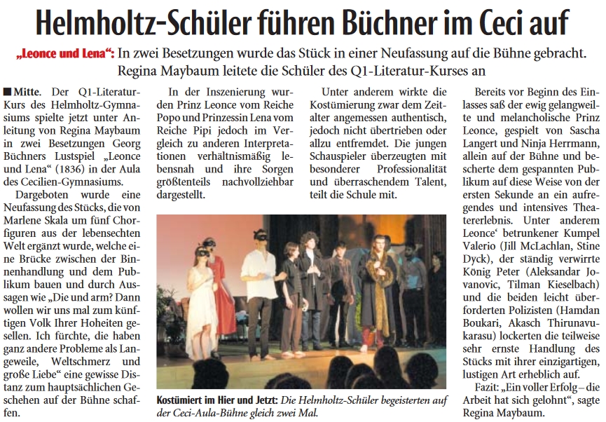 Helmholtz-Schüler führen Büchners „Leonce und Lena“ auf Das Stück wird in einer brillanten Neufassung gebracht. mehr … 19.07.2017 nw.de